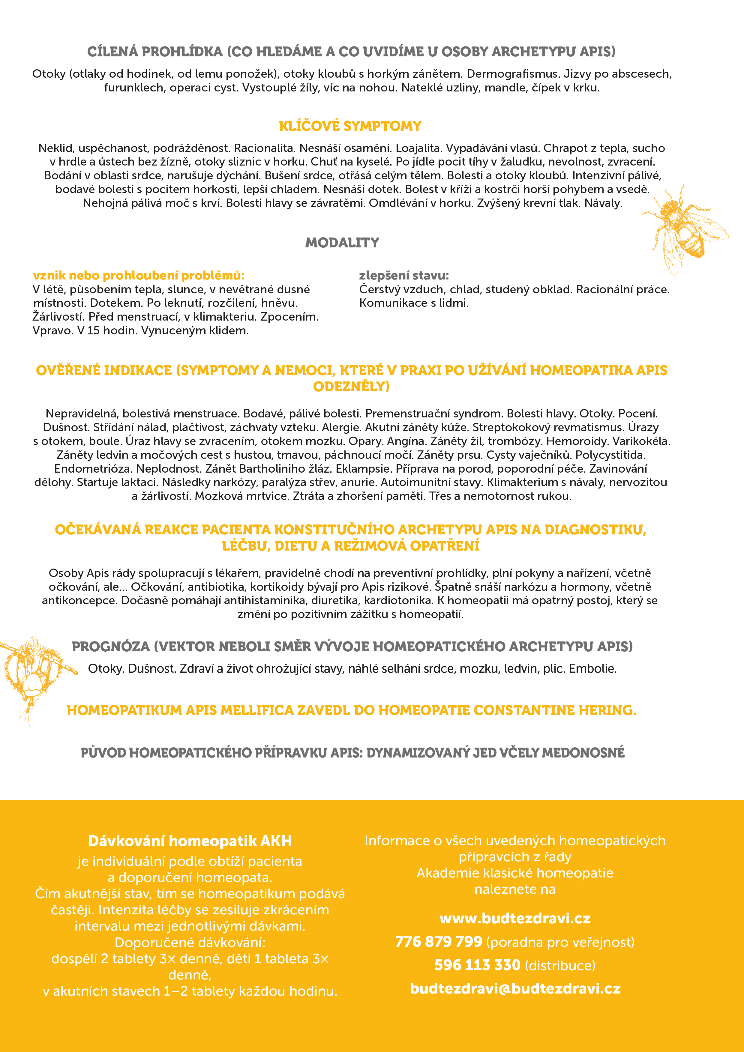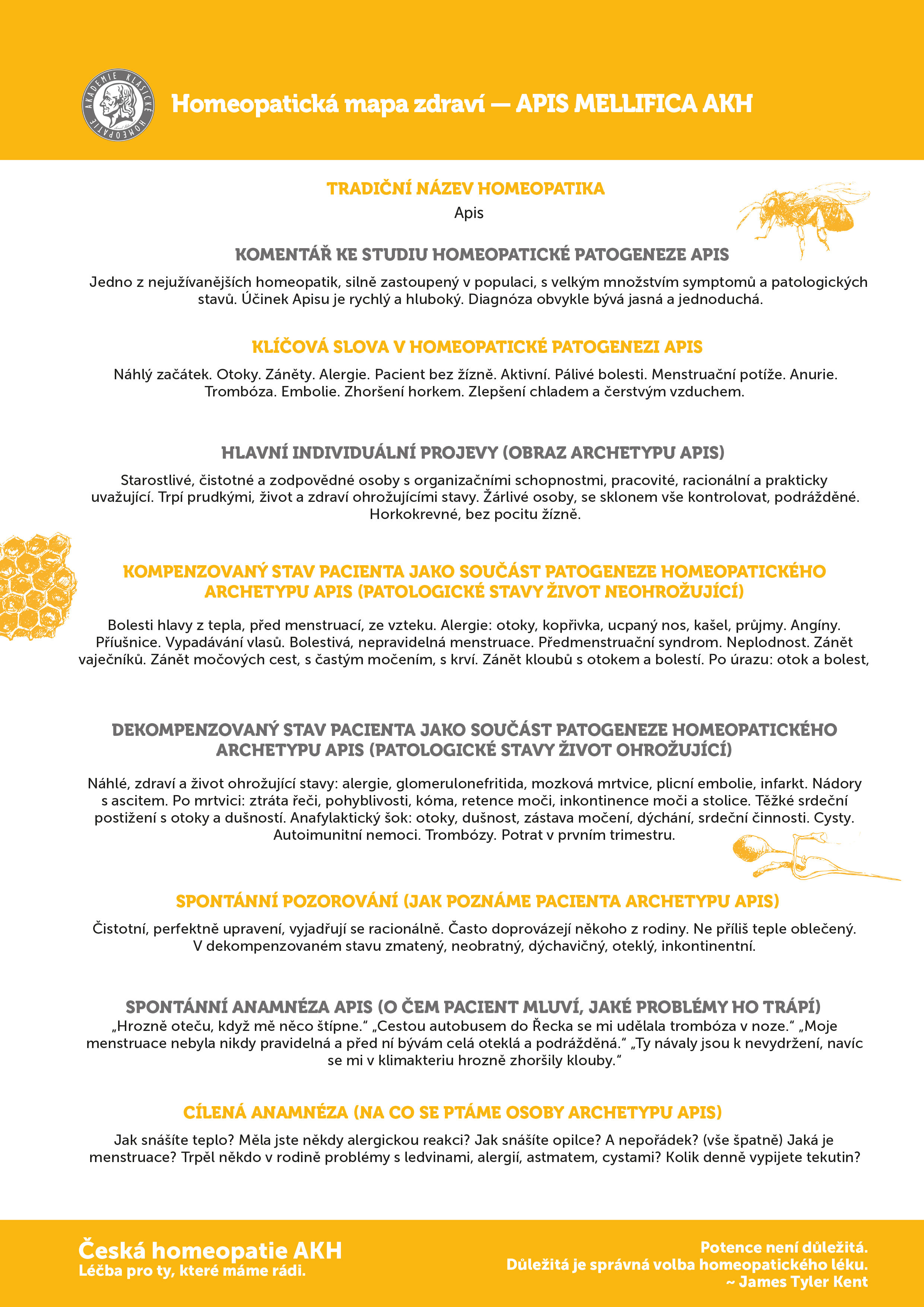 Mapa zdraví s lékem Apis mellifica AKH ti pomůže zorientovat se v typickém obrazu tohoto dynamického homeopatika. Apis je lék pro akutní a život ohrožující stavy, rychlé otoky, pálivé bolesti, alergie a záněty, které se objevují náhle, bez žízně a se silnou reakcí na teplo.