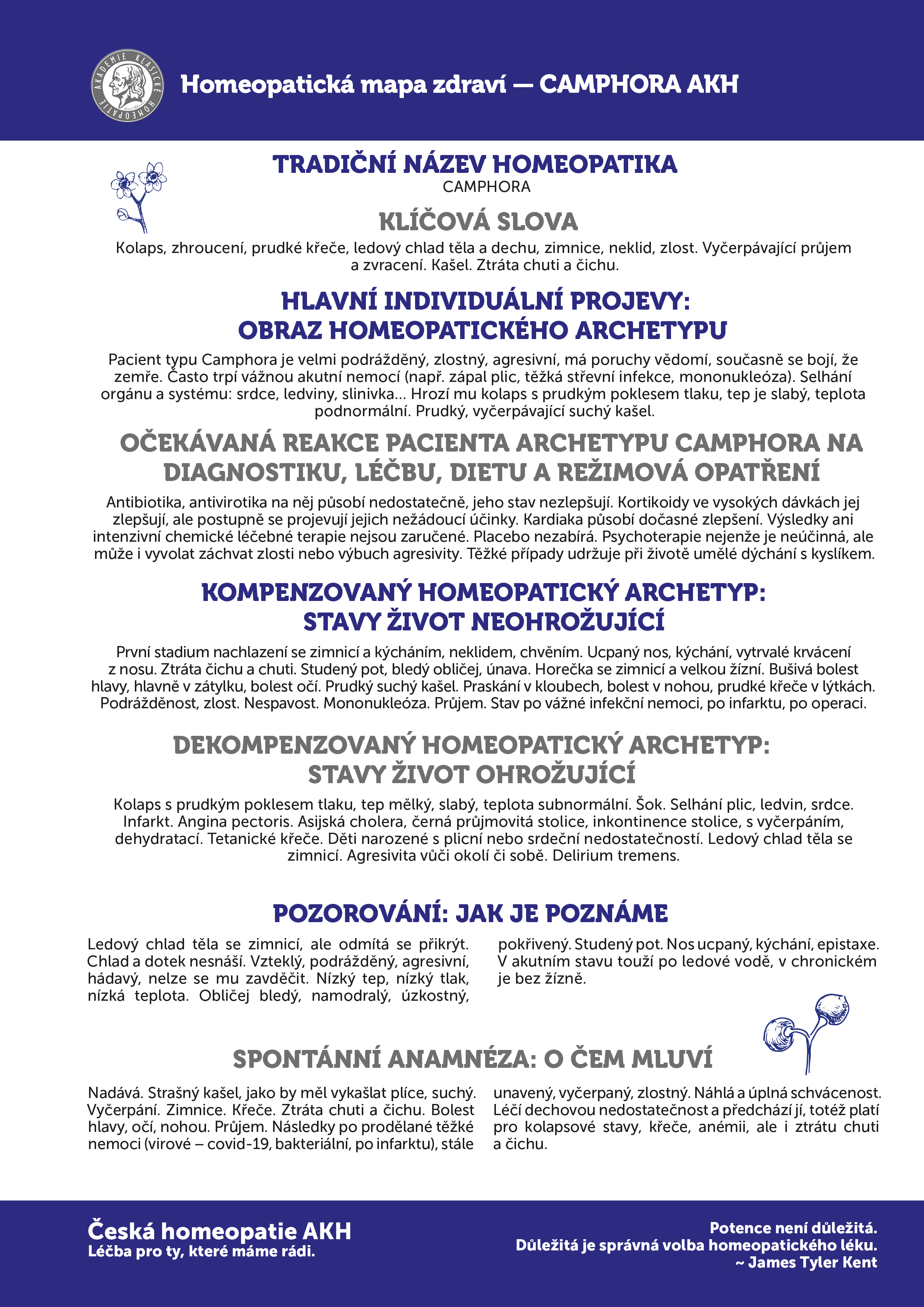 Obraz homeopatického léku Camphora AKH je jeden z nejdramatičtějších v homeopatii. Pacient se nachází na hranici vitálních funkcí: je bledý, ledově chladný, s nízkým tlakem, slabým tepem a subnormální teplotou. Zimnice jej svírá, ale jakékoli přikrytí odmítá. Stav je spojen s hlubokou únavou, agresivitou, dezorientací a intenzivním strachem ze smrti.