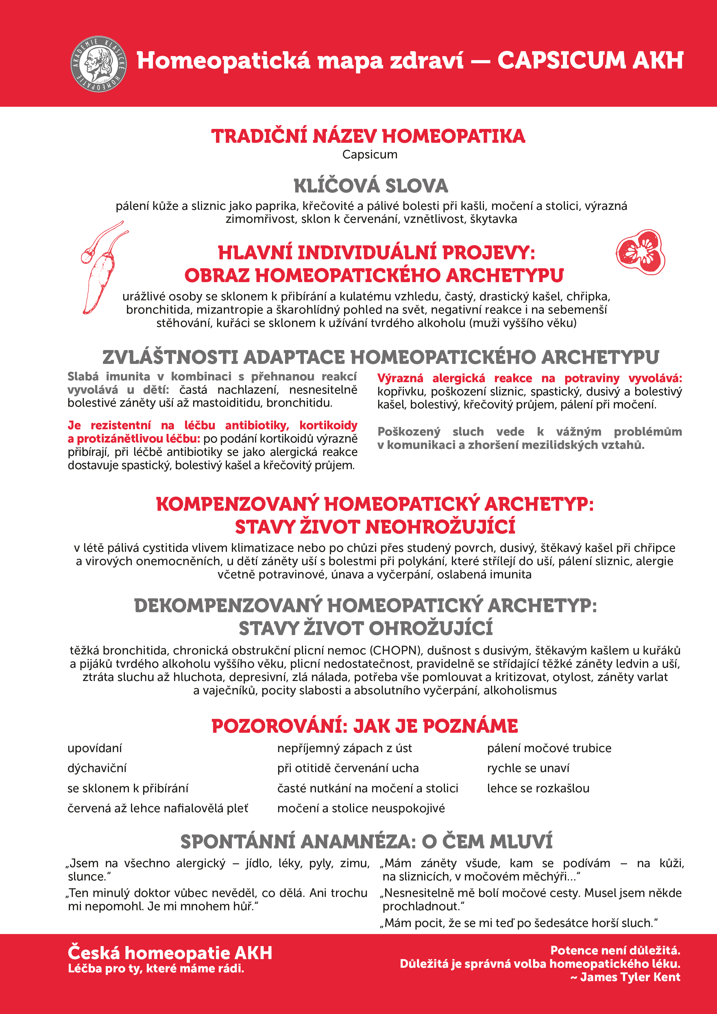 Obraz Capsicum AKH je typický pro pacienty, kteří mají přehnané reakce kůže i sliznic a jejich tělo reaguje „jako po paprice“ – pálením, štípáním, křečemi a prudkými záněty. Každé zakašlání vyvolá další kašel, tvář je rudá až fialová, pacient nadává, odsekává a je výrazně urážlivý. Je zimomřivý, špatně snáší chlad, průvan, studený vzduch a reaguje zhoršením téměř na každý podnět.