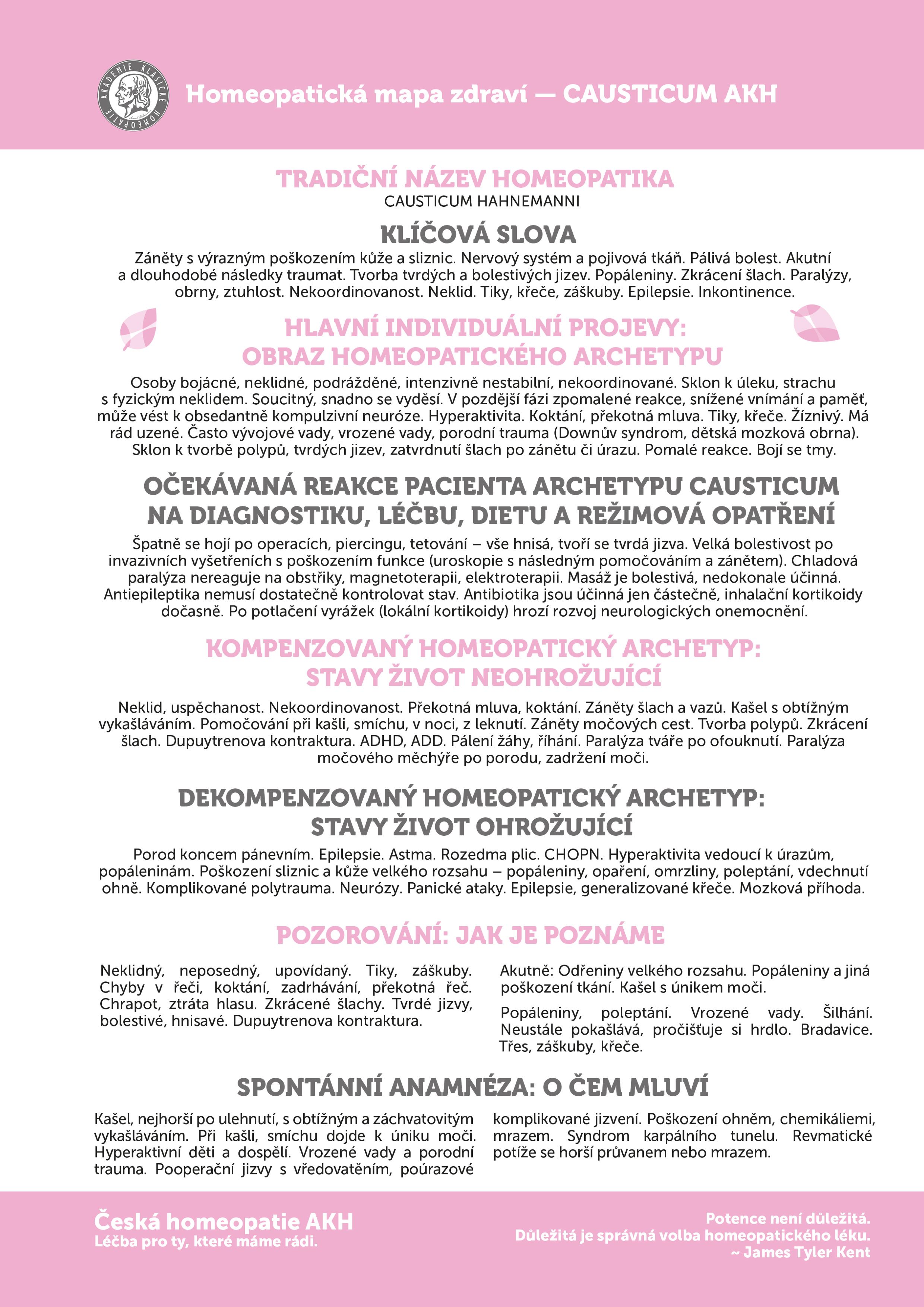 Causticum AKH je lékem hlubokého poškození tkání a nervového systému. Pomáhá u popálenin, jizev, paralýz, poruch řeči, inkontinence, kašle i u neurodegenerativních procesů. Jeho obraz je klíčový tam, kde tělo reaguje bolestí, stažením a poruchou koordinace, a kde se tkáně nedokážou správně hojit.