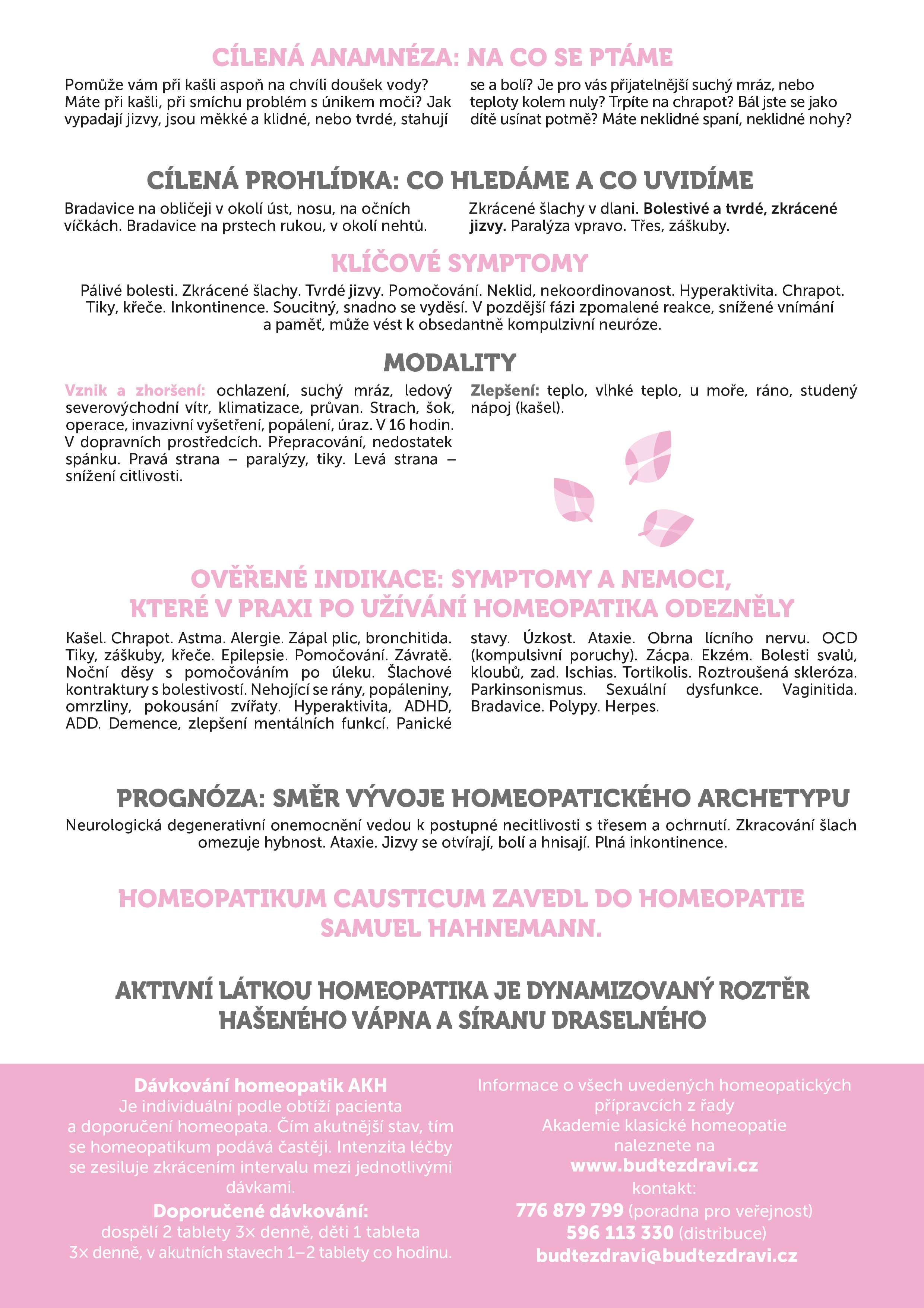 Causticum – popálenina nervového systému, ztuhlost, křeč a nestabilita.