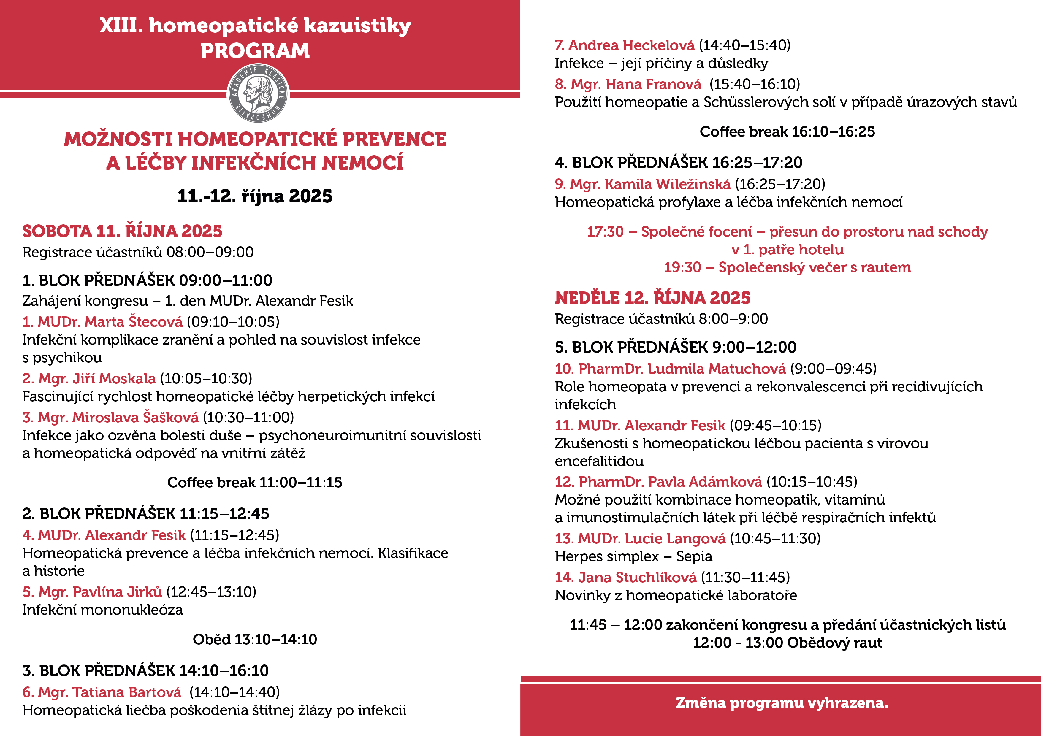 "Upozorňujeme účastníky Homeopatických kazuistik 2025, že během akce budou pořízeny fotografie a zaznamenány data pro dokumentační účely. Tyto materiály mohou být publikovány Akademií klasické homeopatie na našich webových stránkách (budtezdravi.cz, studujtehomeopatii.cz, Homeopatroku.cz) a sociálních sítích (Facebook: Akademie klasické homeopatie, studujtehomeopatii.cz @buďte zdraví s Českou homeopatií; Instagram: Česká homeopatie AKH; YouTube: @buďte zdraví s Českou homeopatií). Účastí na kongresu vyjadřujete souhlas s možným zveřejněním těchto materiálů."